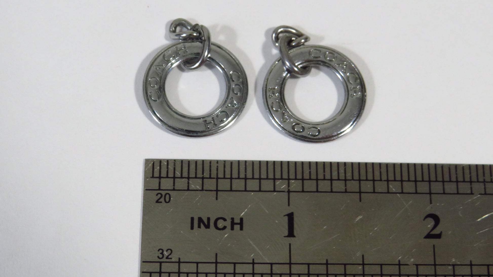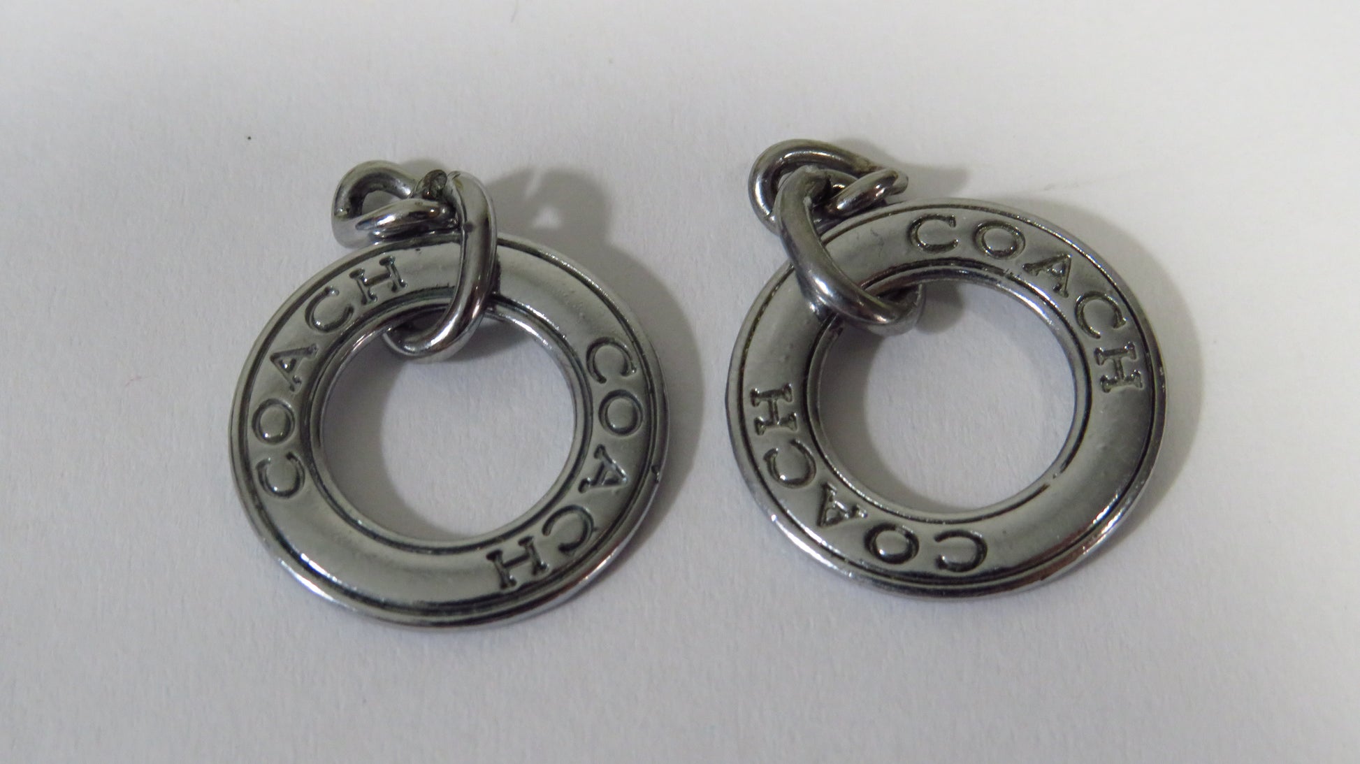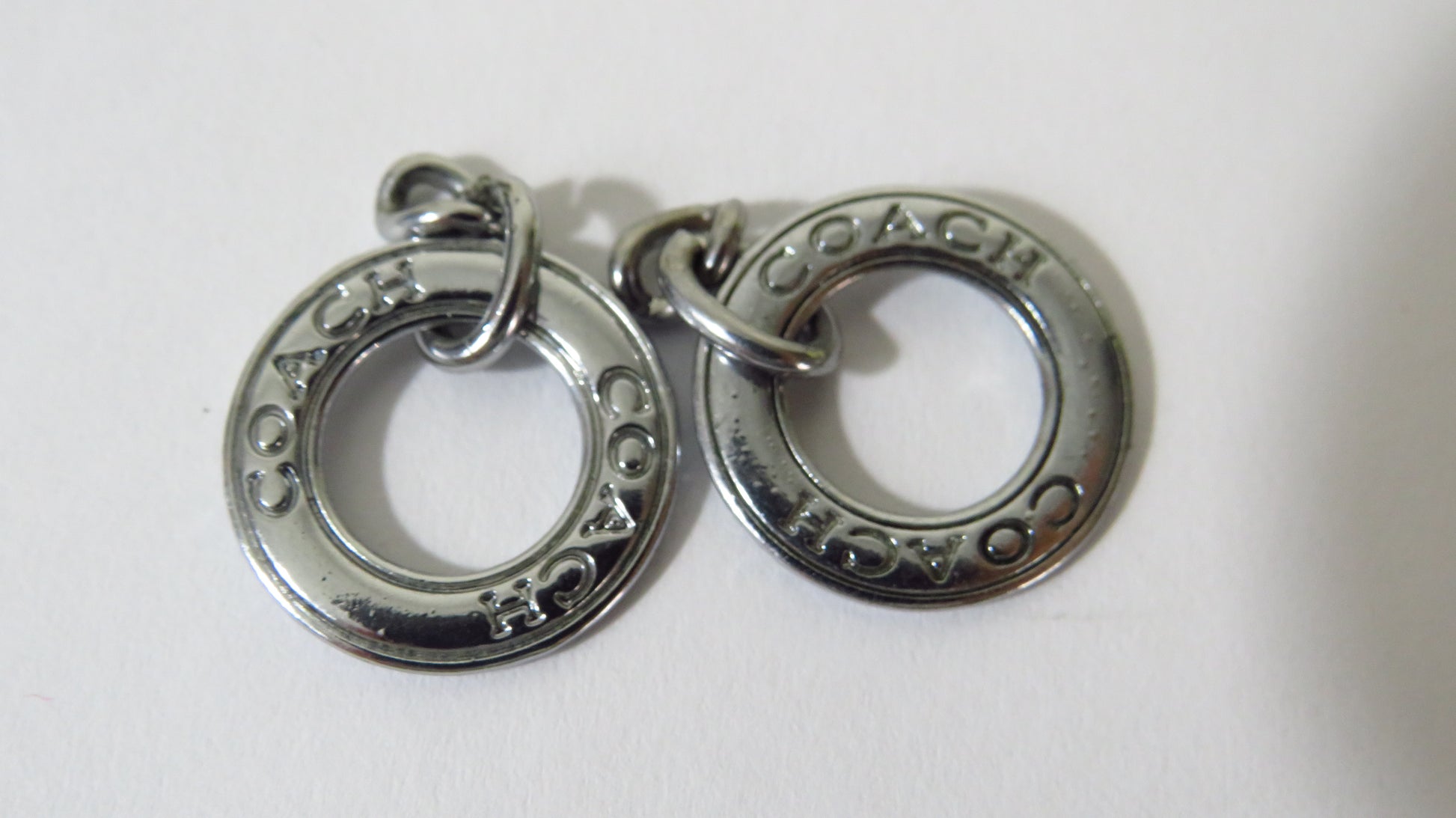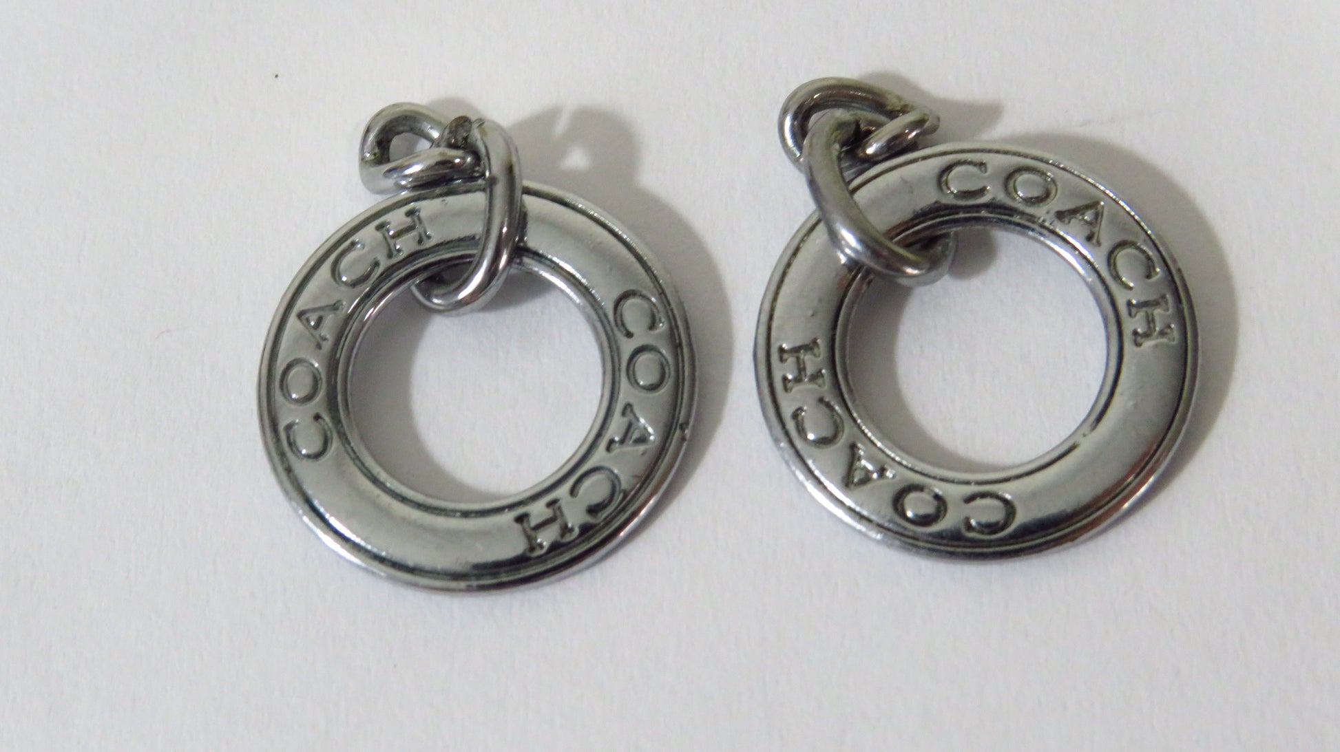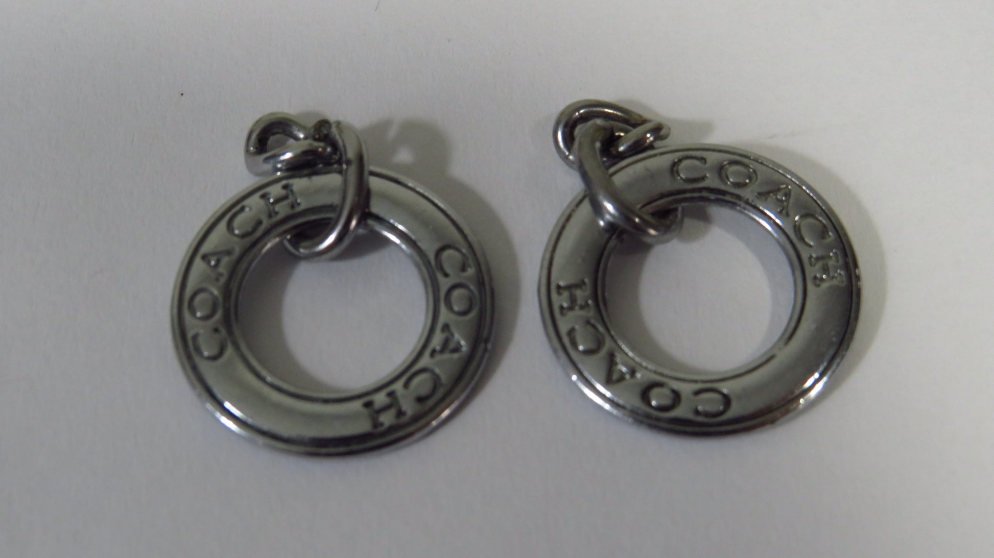 Bundle of 2 Coach charms! They were upcycled from a charm bracelet and are in great used condition! You may wish to cut off one of the loop ring links from the chain, it is your call. These are double side engraved and are 20mm across. Thank you for your business!